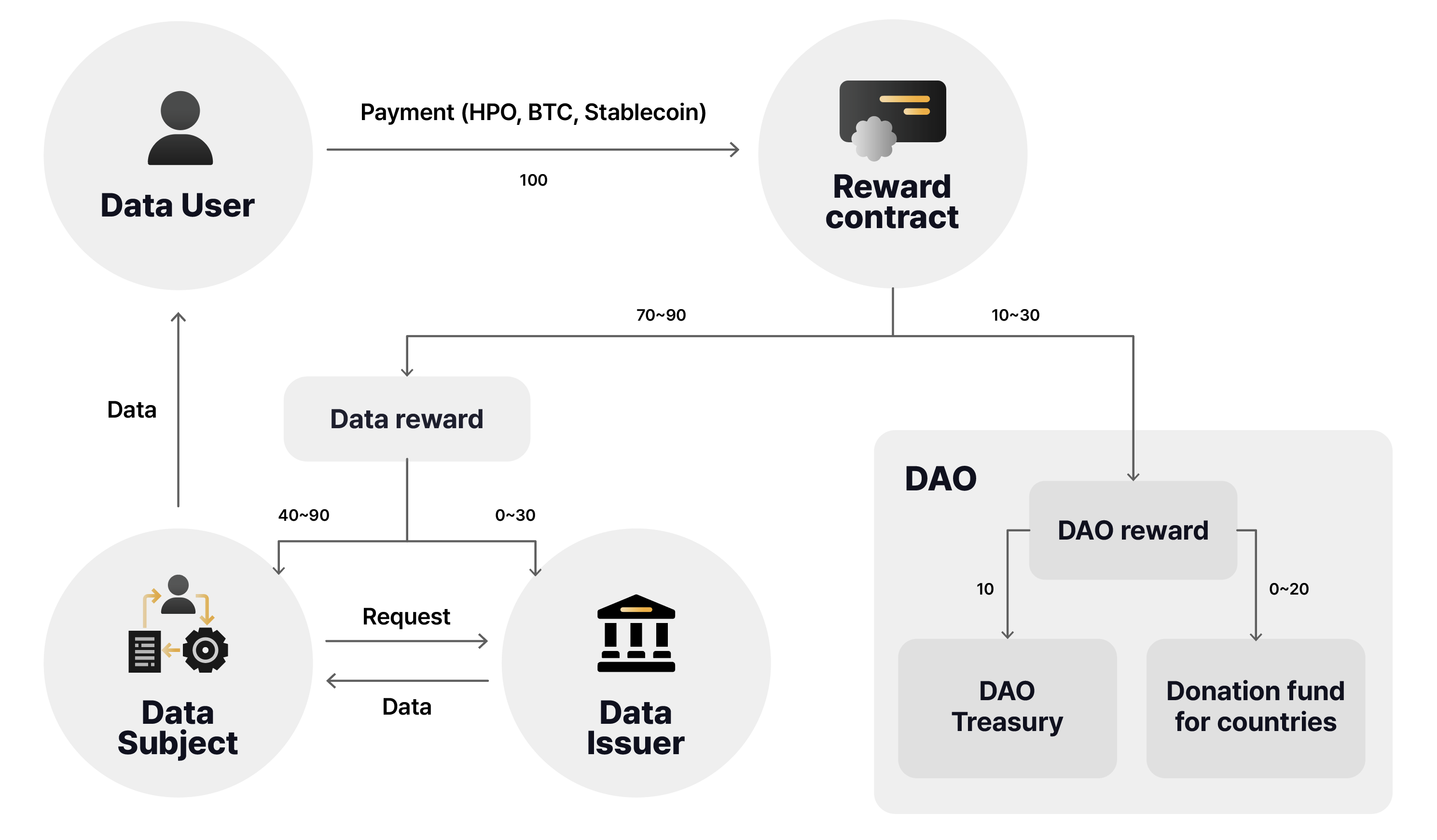 Data subjects hold the right to view and decide how their data is used and transacted. They can benefit from services using their data as an incentive and accept financial compensation offered by data utilizers for sharing their data. The data subject and the data issuer then proportionally share the remainder, excluding protocol fees and deductions for public healthcare financing. However, the principle is that the data subject receives the most substantial share under all conditions, with a minimum of 40% and a maximum of 90% of the total reward going to the data subject.